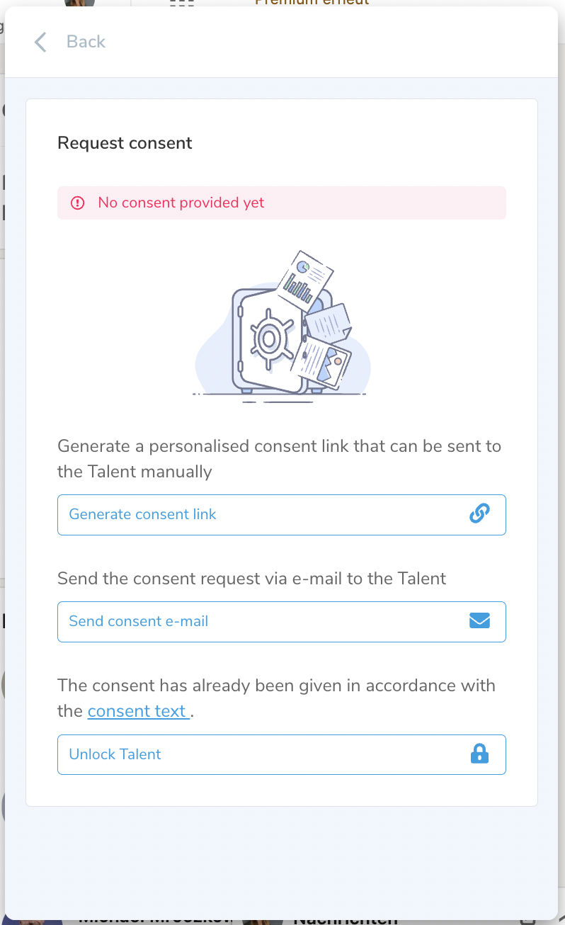 • Direkt nach dem Klick, kann der/ dieNutzer:in eine Option auswählen, um die DSGVO-Einwilligung für das Talent anzufordern