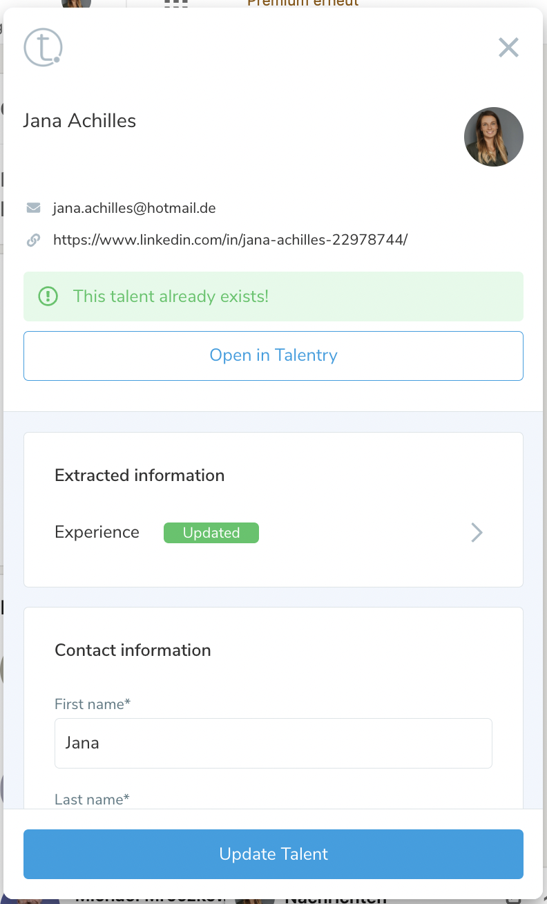 Wenn das Talent, das Sie extrahieren möchten, bereits in Ihrem CRM vorhanden ist, werden Sie in der CleverConnect Sourcer Ansicht darüber informiert: Sie sehen einen grünen Informationsbanner mit der Aufschrift: "Dieses Talent existiert bereits!".