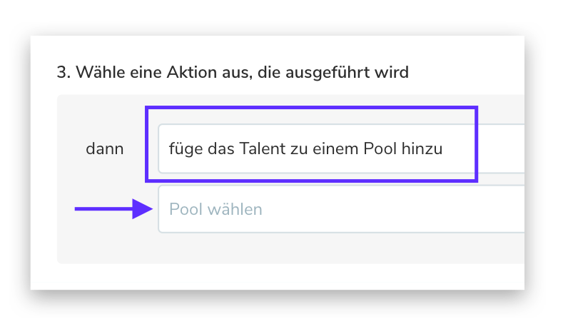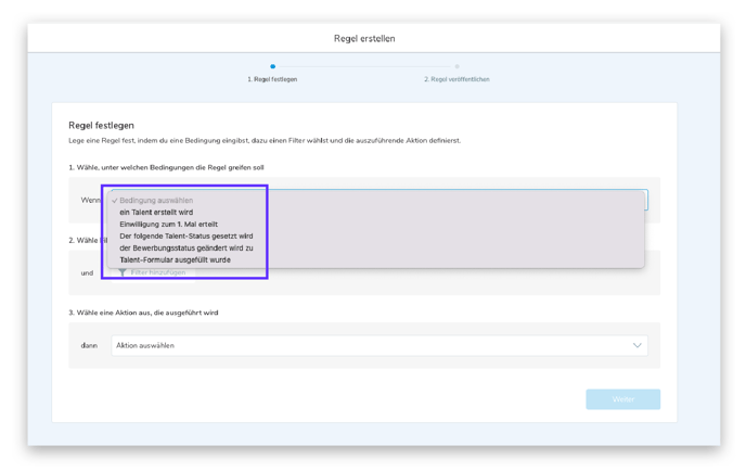 Sie können den Trigger "Wenn ein Talent erstellt wird" auswählen. Dies kann ein sehr allgemeiner Indikator sein, so dass Sie auch angeben müssen, welche Talente von dieser Automatisierung betroffen sein sollen, indem Sie unter Punkt 2 (Filter) die Eigenschaften definieren, die dieses Talent haben muss, um die Aktion auszulösen.