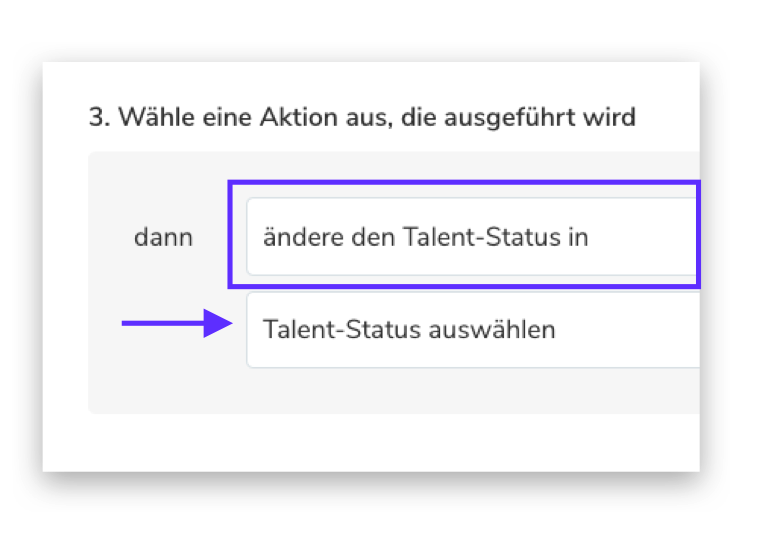 Wenn Sie im ersten Schritt "Wenn der folgende Talent-Status gesetzt wird" als Trigger auswählen, müssen Sie auch angeben, welchen Talent-Status Sie wünschen. Dies können Sie in der sich öffnenden Auswahlliste rechts unten > "Talent-Status auswählen" tun. Hier stehen die von Ihnen angelegten Talent-Status als Auswahl zur Verfügung.
