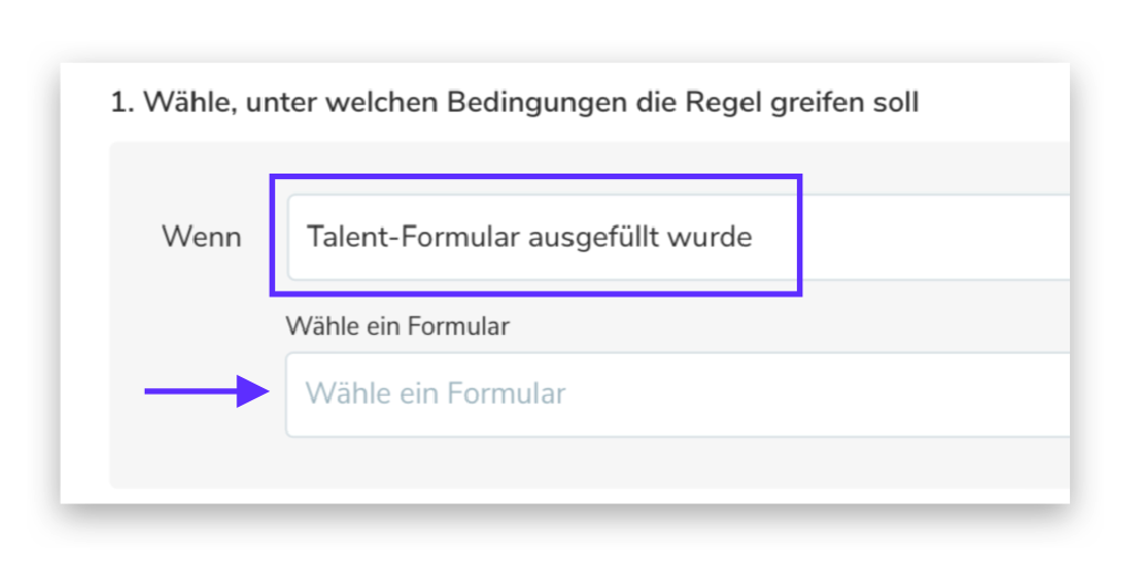 Sie müssen als Auslöser "Wenn Talent-Formular ausgefüllt wurde" auswählen und gleich danach im Dropdown-Menü das gewünschte Formular angeben > "Wählt ein Formular".