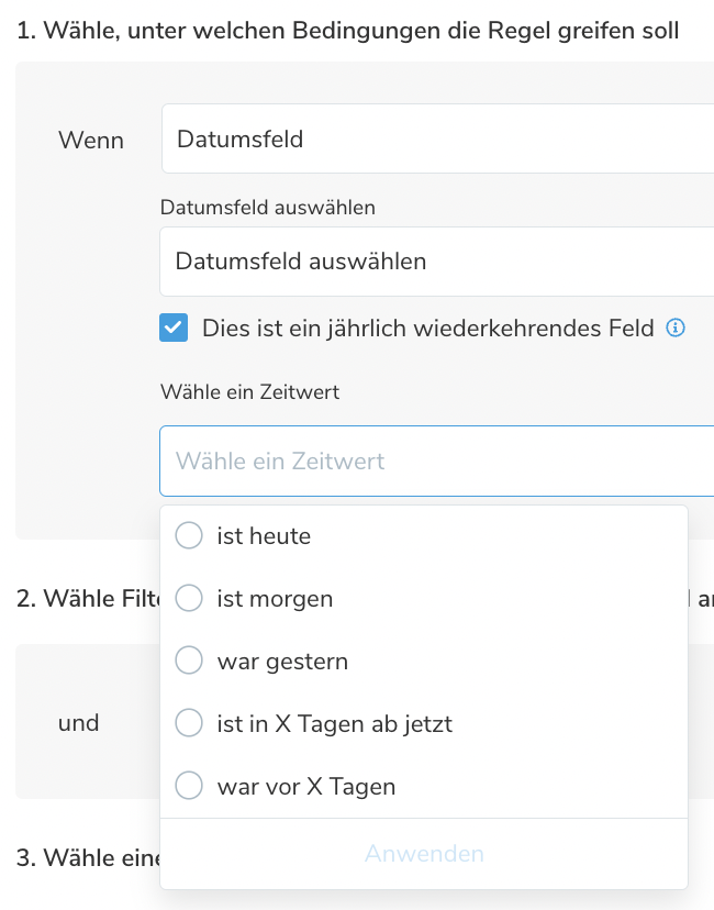 Der letzte Schritt besteht darin, festzulegen, WANN die Aktion ausgelöst werden soll. Es gibt hier verschiedene Option. Zum Beispiel, am selben Tag (heute), einen Tag vor dem Datum (Morgen) oder x X Tage davor oder nach dem Datum.