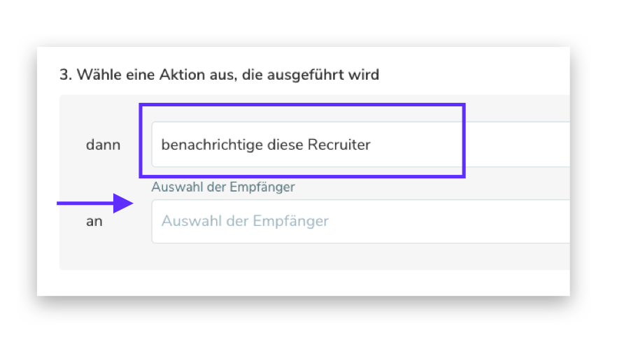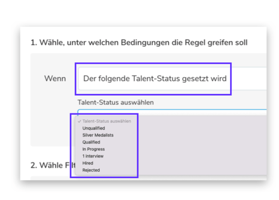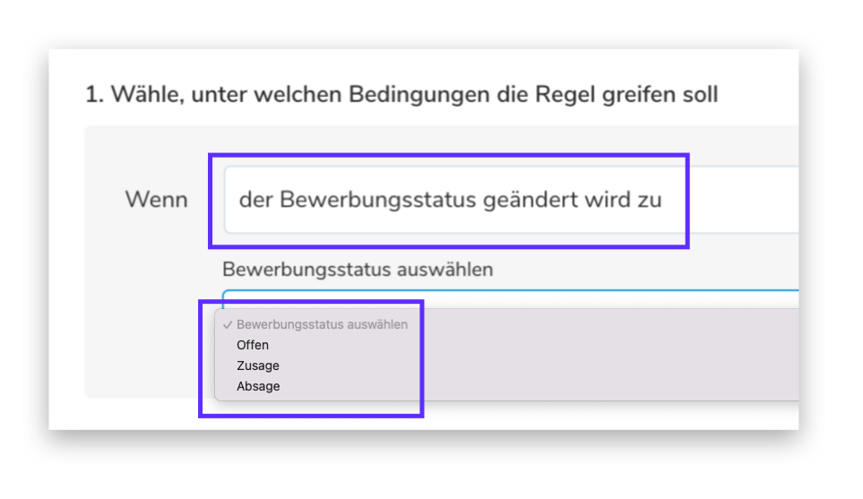 Wenn Sie in Schritt 1 "Wenn der Bewerbungsstatus geändert wird zu" als Auslöser wählen, müssen Sie auch angeben, welchen Bewerbungsstatus Sie wünschen. Das können Sie in der Dropdown-Liste tun, die sich direkt unter > "Bewerbungsstatus auswählen" öffnet.