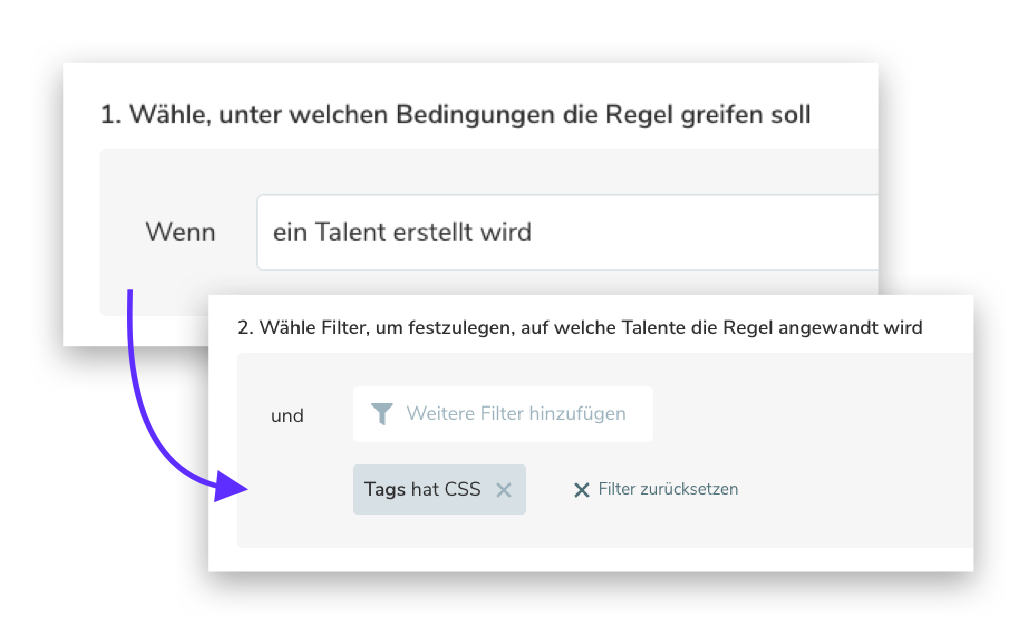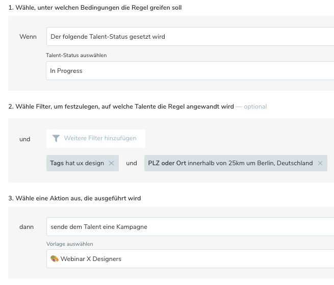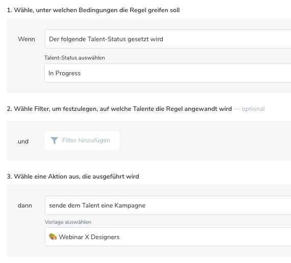 Filter sind optional. Lediglich bei der Trigger-Option "Talent wird erstellt" und "Einwilligung zum 1. Mal erteilt" ist ein Filter verpflichtend.