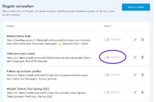 ⚠️ Talente, die zum Zeitpunkt der Aktivierung bereits unter die Kriterien der Automatisierung fallen, werden nicht in diese aufgenommen. Erst nach einer Änderung, die eine Automatisierung auslösen würde, werden die Talente mit aufgenommen. |