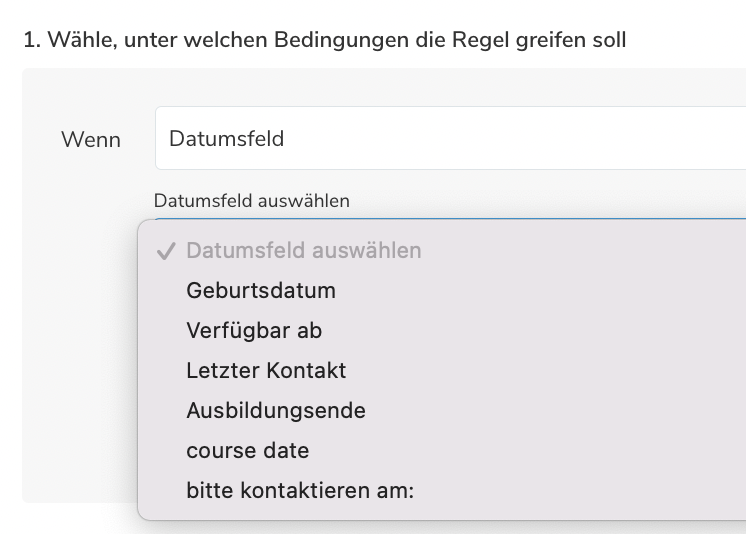 Das Datumsfeld hilft dabei eine manuelle Aktion zu automatisieren, die auf einem Standard- oder benutzerdefinierten Datumsfeld im Talentprofil basiert. Im ersten Schritt wird das spezifische Datumsfels ausgewählt.