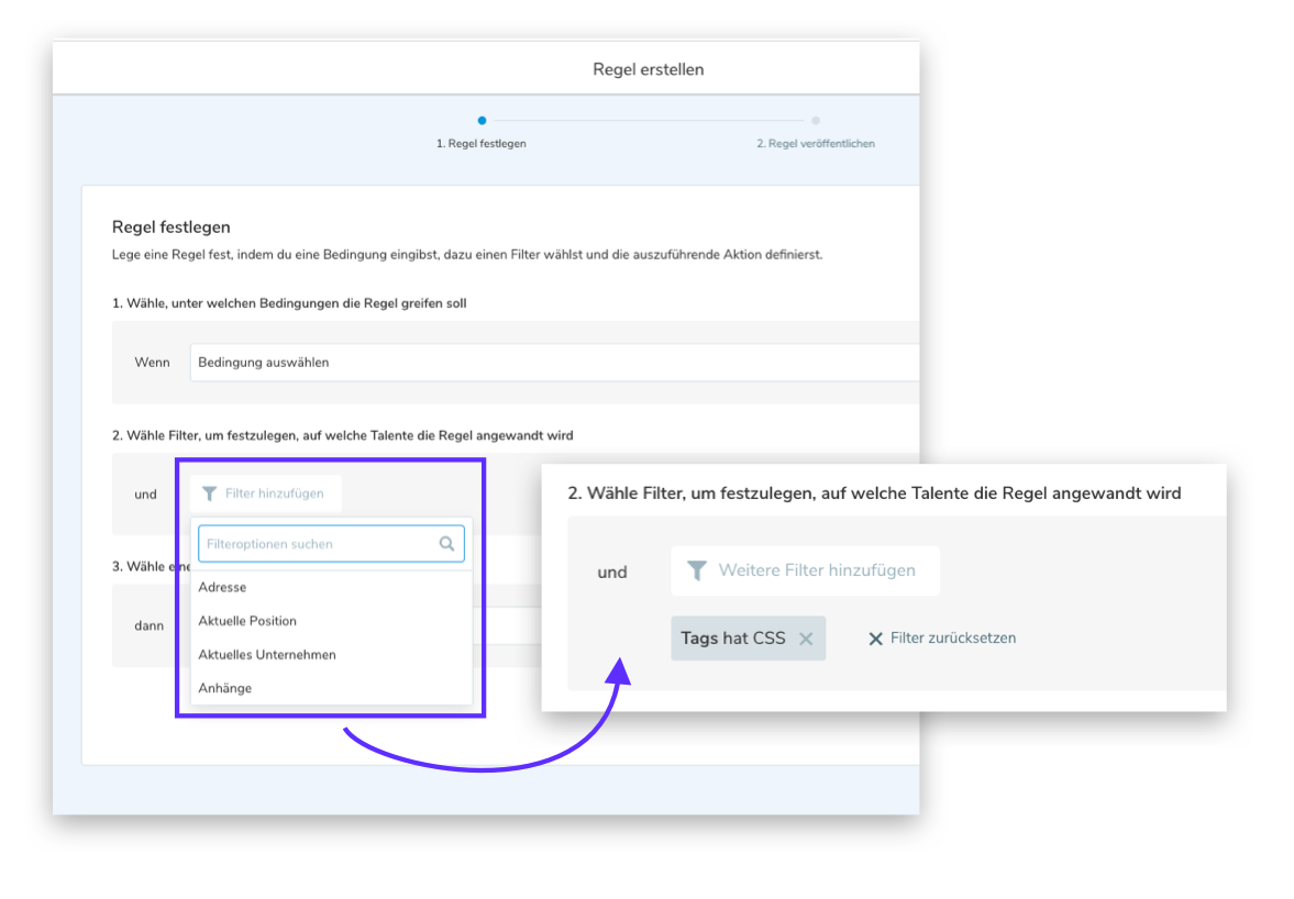 - Kennzeichnen Sie viele Talente auf einmal mit bestimmten Tags, um sie zu einem späteren Zeitpunkt in der Übersicht leichter zu finden oder auch um so die Zielgruppe für Kampagnen zu bestimmen. Wählen Sie aus den bereits bestehenden Tags den entsprechenden aus oder erstellen Sie (je nach Tag-Management Einstellungen) für diese Automatisierung einen neuen, eigenen Tag.