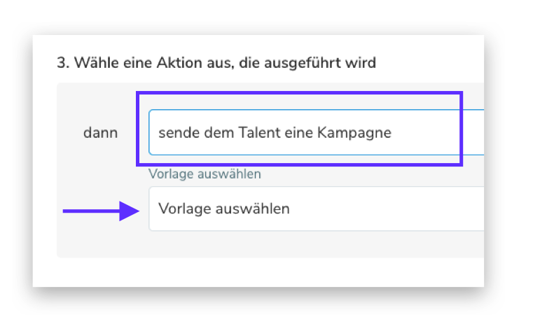 - Möchten Sie mit bestimmten Talenten inKontakt treten und eine Talent Kampagne verschicken? Wählen Sie eine vorher von Ihnen erstellte Talent Kampagnen-Vorlage aus, die an die Talente versendet werden soll.