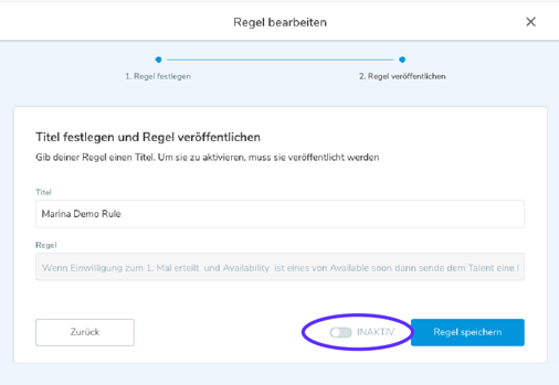⚠️ Sie müssen die Regel aktivieren, indem Sie den Kippschalter im letzten Schritt der Regelerstellung einschalten oder in der Tabelle, in der alle Regeln aufgelistet sind |