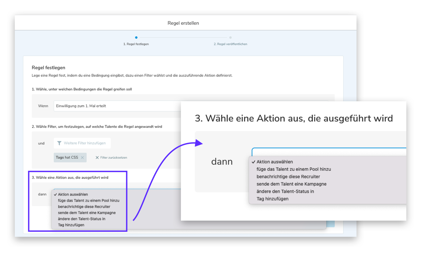 Ab jetzt sind sowohl Aktionen für Änderungen der Bewerbung als auch des Talentstatus verfügbar, außerdem lässt sich ein Talent nun zu mehreren Tags/Pools zuweisen und automatisch die Aufforderung zur Datenschutz-Einwilligung versenden, wenn eine bestimmte Bedingung erfüllt ist.