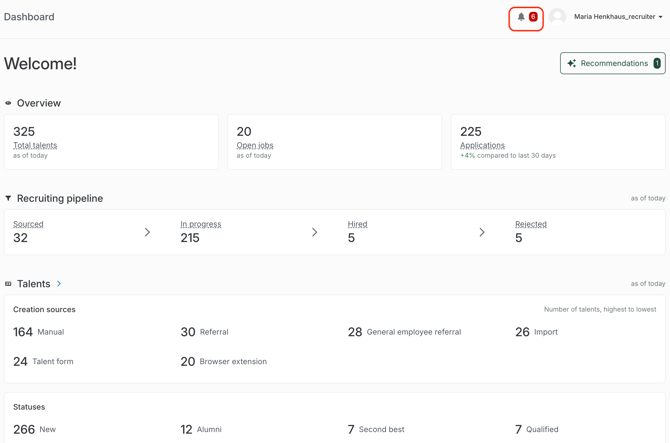Deshalb haben wir eine Benachrichtigungsfunktion für Recruiter entwickelt, mit der alle erfassten Aktivitäten, die normalerweise nur per E-Mail verschickt würden, auch im Dashboard angezeigt werden.