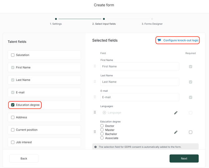 Knock-out-Fragen sind frühzeitige Bewertungsfragen im Talentformular. Sie dienen dazu, Kandidaten, die die erforderlichen Qualifikationen für eine Stelle nicht erfüllen, schnell auszusortieren. Beispielsweise können Kandidaten mit einem bestimmten Abschluss, Zertifikaten oder einem bestimmten Standort erforderlich sein.