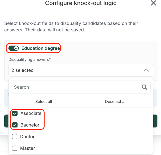 Anschließend können Sie die disqualifizierenden Antworten auswählen, die das Talent letztendlich aus dem Auswahlprozess ausschließen. Wenn der Kandidat – in diesem Fall – nur einen Bachelor-Abschluss hat, wird ihm der Rest des Formulars nicht angezeigt.