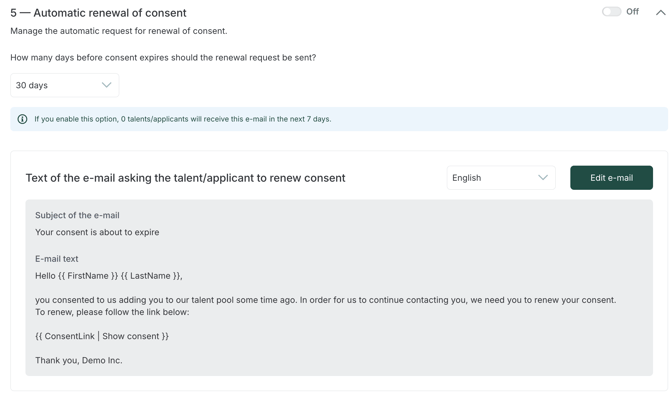 You can ensure that talent leads regularly renew their consent by enabling the auto-renewal request. Based on the consent expiration date, you can specify how far in advance you wish to automatically ask people to renew their consent