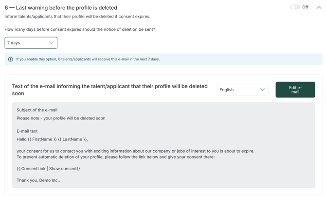7 — Enable Automatic deletion of talent profiles when consent expires, is refused or withdrawn