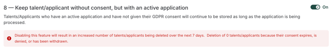 8 — Enable to keep talents/applicants without their consent, but who have an active application