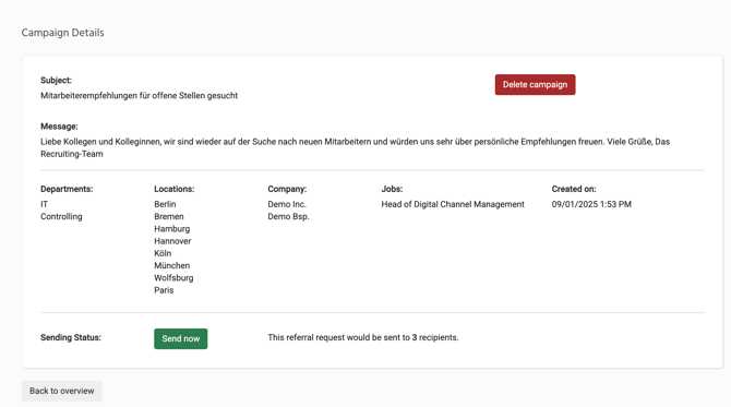 Before sending, you have the option to delete the campaign or return to the overview. Once you return to the overview, you can no longer edit the campaign. Your only options are either delete or send.