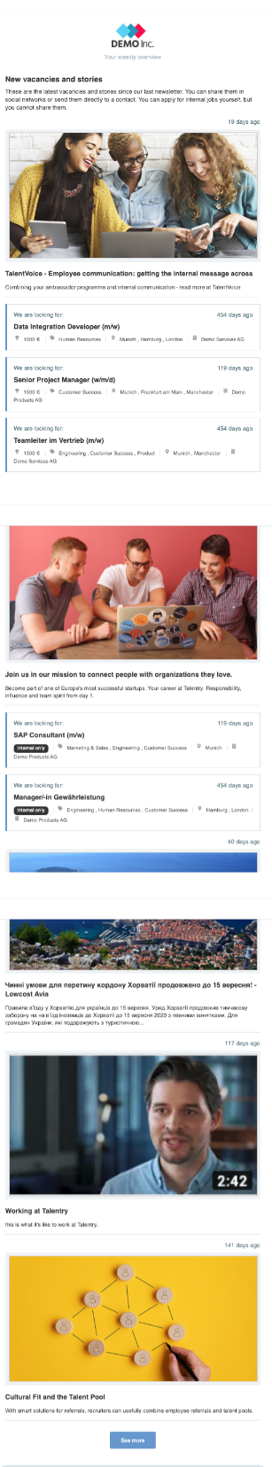 Our newsletter informs your employees about new job vacancies and stories you have published on your platform. The jobs are displayed with the details of the department, location, company (if you have more than one company in your system) and also the reward for a successful hire. Stories are shown with the preview picture. The publishing date is also displayed. Both items are directly linked, which means employees can share them easily by clicking on the job or story in the email. How often is the newsletter sent?You determine the time and frequency of the automatically sent Newsletter. You let us know: