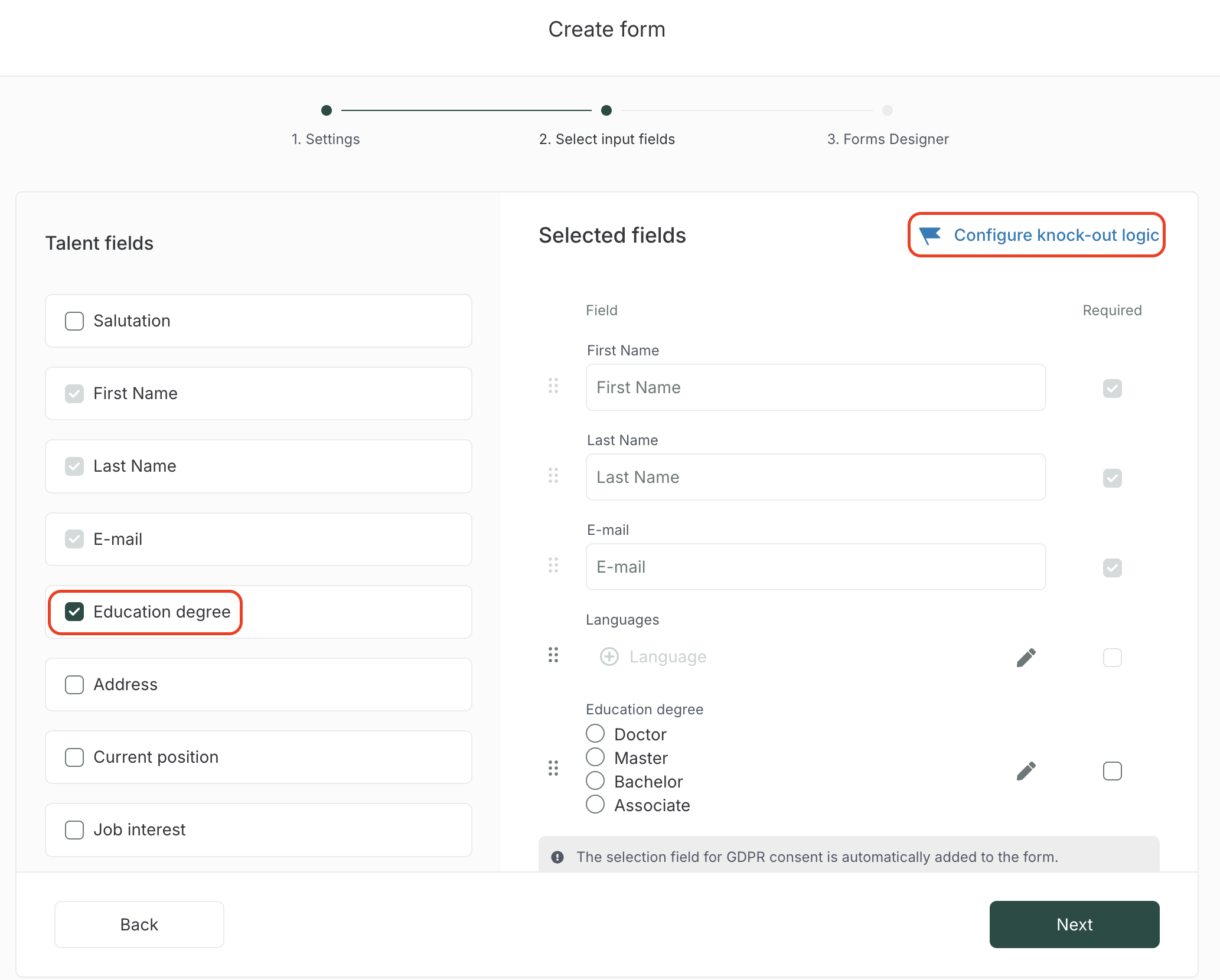 Candidates who fill out such talent form first have to answer qualifying questions. If their answers are accepted they will be able to proceed to the rest of the form. If not, their data will not be saved and they will get a (customisable) message informing them that it did not work out this time.
