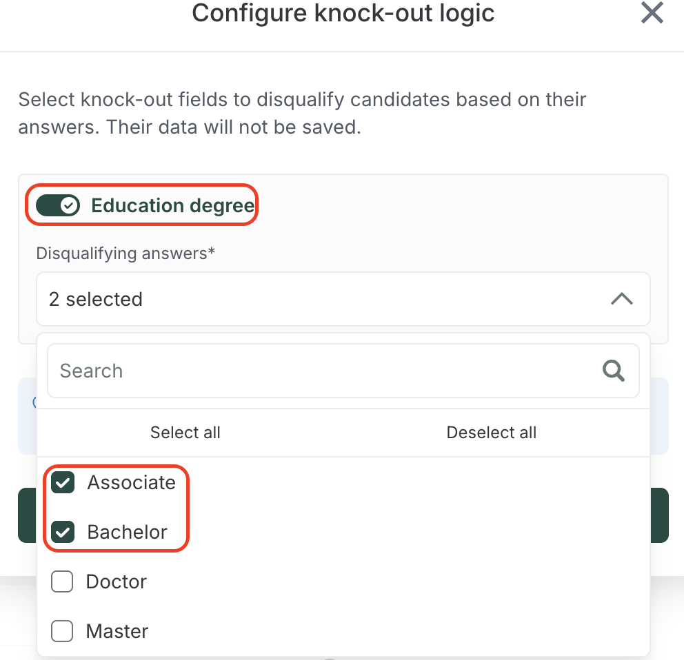 Then you can select the disqualifying answers, which ultimately will knock out the talent from the selection process. If the candidate - in this case - only has a Bachelor's degree the rest of the form will not be shown to him.