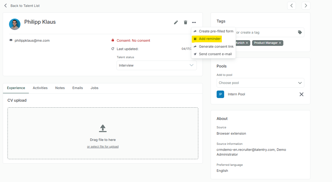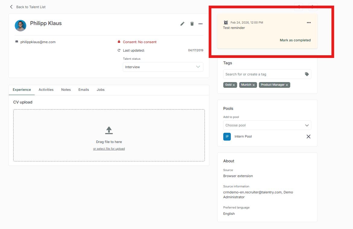 For example, if a Talent is ready to move on with their career 6 months from now, we need to get in touch with them at the right time to be able to convert this person into a new hire. With Reminders, this is possible in the easiest possible way.