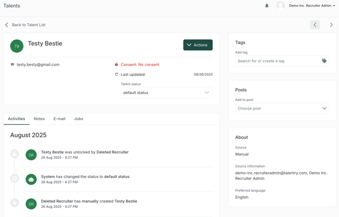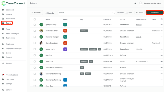 A talent profile is a profile of a talent, which stores all relevant data about a person and about user and recruiter activity. Relevant data are for example: first and last name, email, education level, resume, current position, email history, notes about the person and many more.