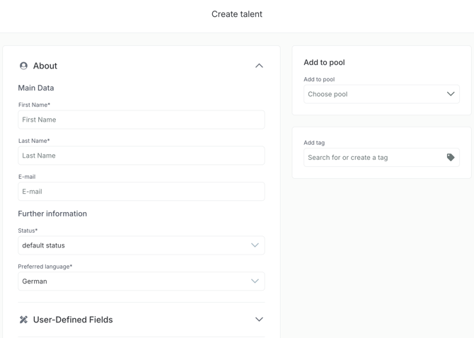 Now the corresponding "Create talent" overview is displayed. Within this view, all relevant information of the talent can now be entered manually. Among other things, files can be uploaded, user-defined fields can be used and privacy queries can be created.