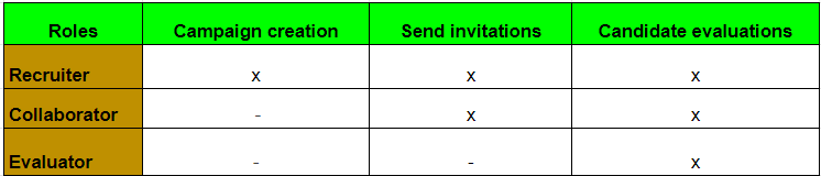 - Recruiter: Create the campaigns, invite the candidates and evaluate them.