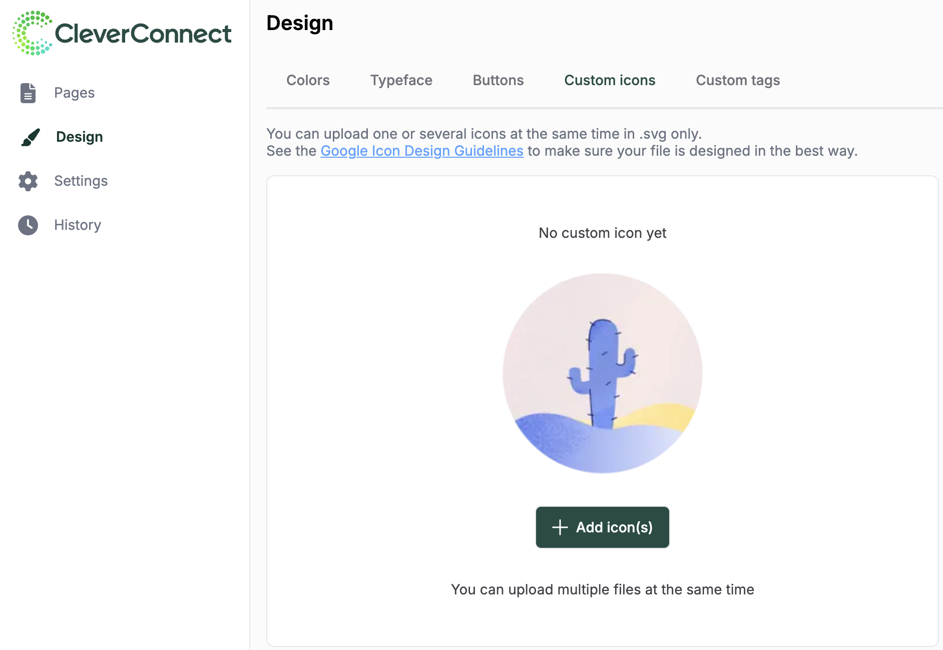 You can upload one or multiple icons simultaneously in .svg format. All icons will be automatically resized to 24x24px.