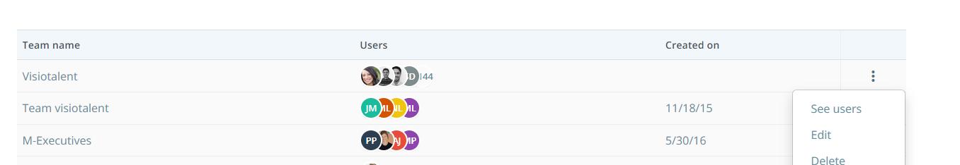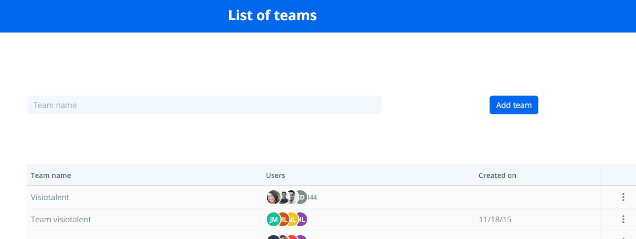 Once a company is set up on Visiotalent, if, for example, it is a company with a few users working together on the same recruitments, it is important to create a Team in which to put all users, so that users can share campaigns with each other and perform actions on them.