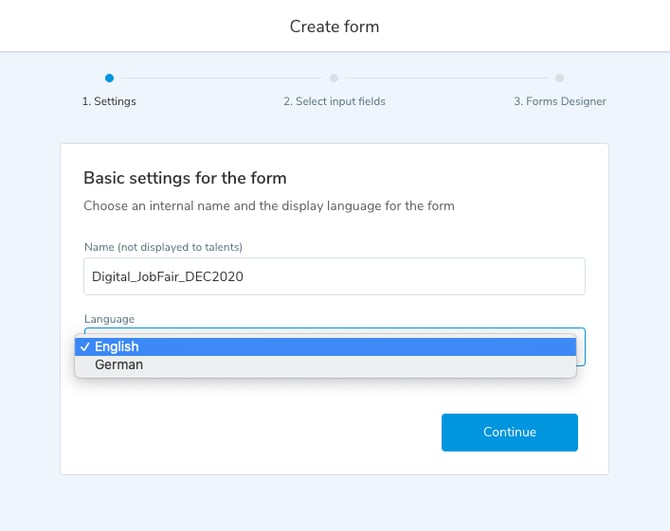 To create a customized form you have to login in to the Recruiter app view and go to Settings > CRM > Talent Forms Only admins can create new talent forms. However, recruiters can get access to the form page with limited rights and thus copy the link of the forms for further usage. |