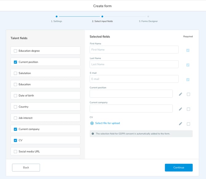 You can select all the available fields you want to include in your form. By default First Name, Last Name, and E-Mail address are already included. You can decide the order of the field when checking in the fields on the left column. Those fields that must be mandatory for the candidate to fill in, can be flagged as "required" just by checking the tickbox on the right of the field. By clicking on the "edit" icon (pencil), it is also possible to change the text of the field label and the placeholder. |
