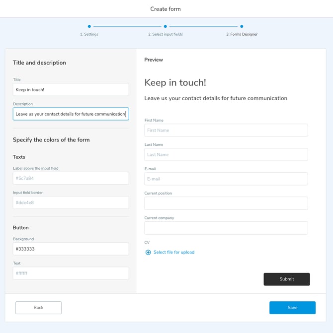 If you want to create new custom fields to add to a form, read this It is possible to customize the form by adding a title, a short description and by changing the colors of the button and of the texts |