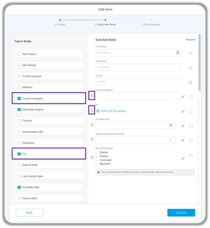 Drag & Drop feature👆When you have created Talent Field, they will appear in the left-hand site column. After choosing one by ticking it, it appears in the right-hand site column. |