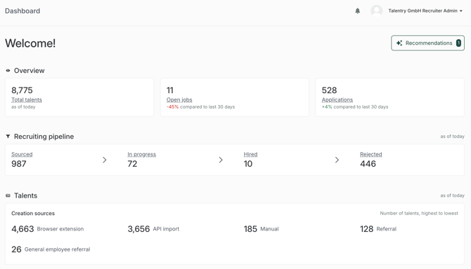 - A dashboard with all numbers regarding your candidate relationship management (CRM) platform: talents, recruiter activity etc. (external access via a link provided by your Customer Success Manager)