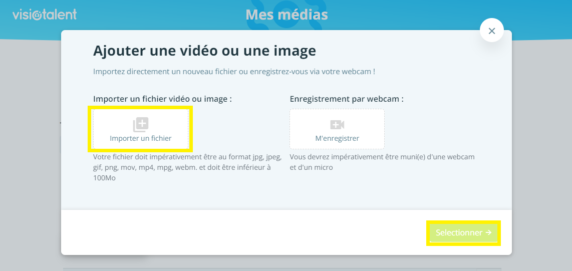 2. Sélectionner un média depuis un ordinateur ou utiliser une webcam pour un enregistrement en direct.