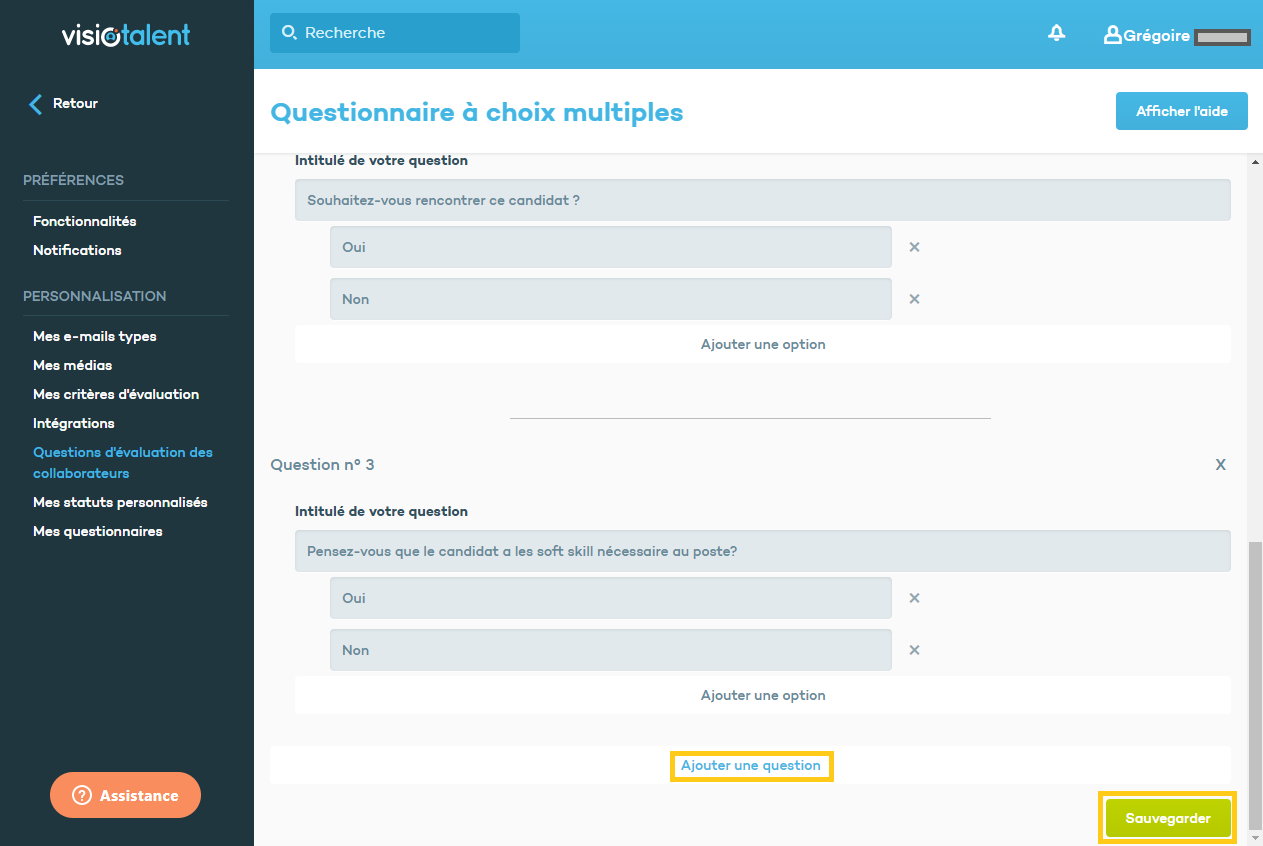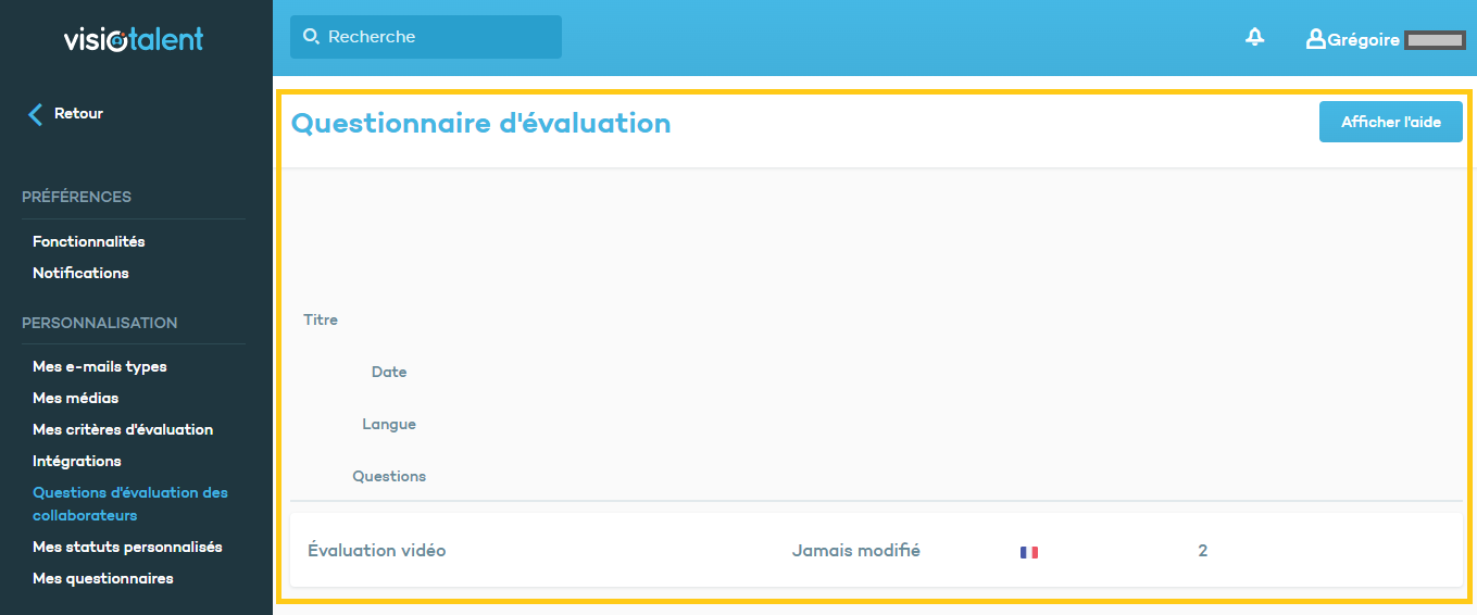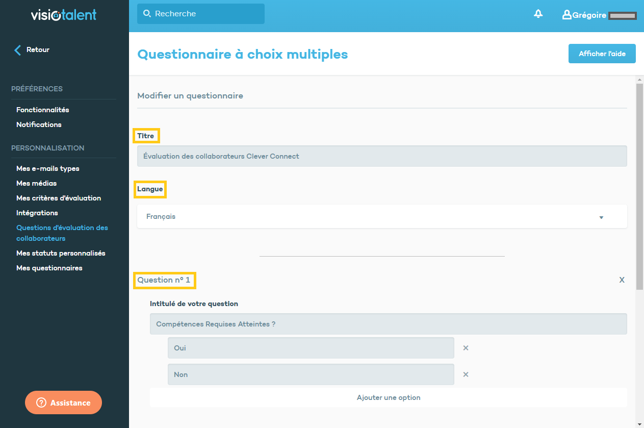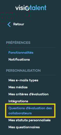 Pour créer ce questionnaire, vous devez vous rendre sur Visiotalent, allez dans le menu principal et cliquez sur Réglages puis sur Questions d'évaluation des collaborateurs. Cliquez ensuite sur le questionnaire qui apparaîtra afin d'accéder à la page d'édition.