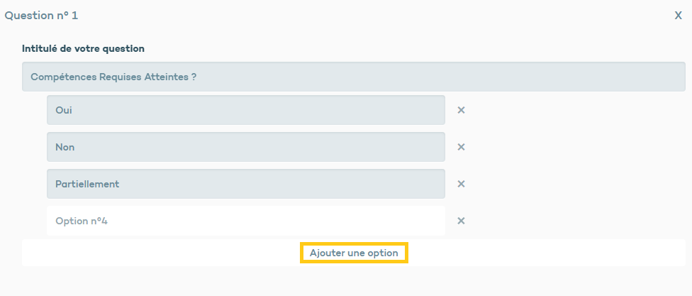 Ici, vous pouvez modifier les questions par défaut, ajouter des options en cliquant sur "ajouter une option" et supprimer des options en cliquant sur le X à côté de l'option.