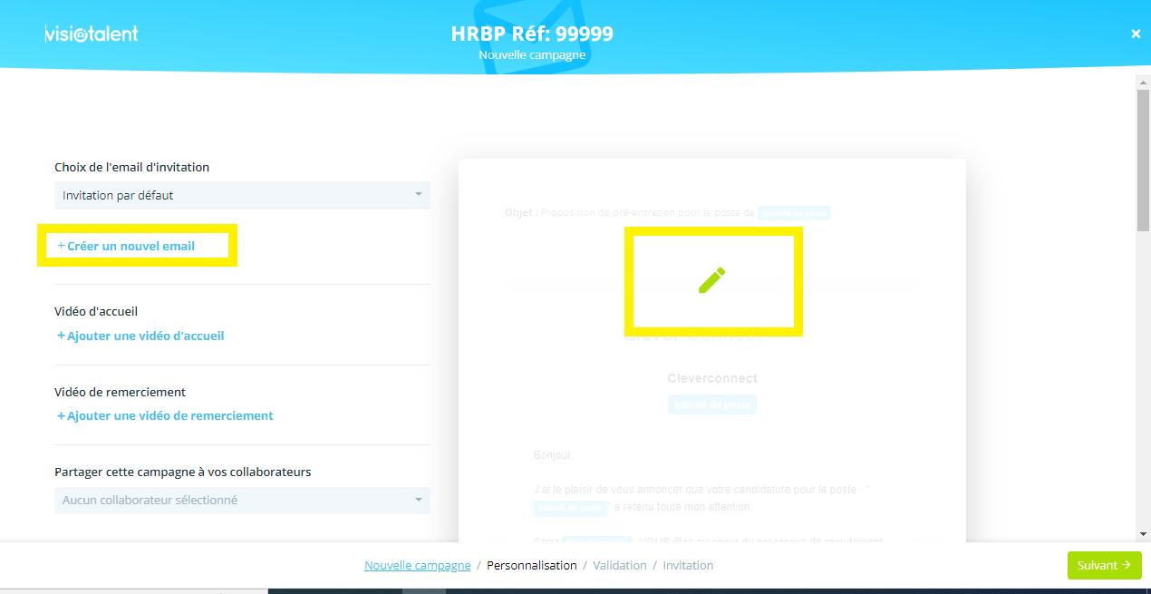 Sélectionner un email personnalisé préalablement écrit ou modifier l’email par défaut en cliquant sur le crayon vert présent au survol de l’email.