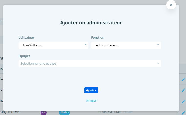 À ce point, vous pourrez modifier l'utilisateur, la fonction (en choisissant Admin ou Super Admin) et décider de lier une équipe, plusieurs équipes ou toutes à cet administrateur.
