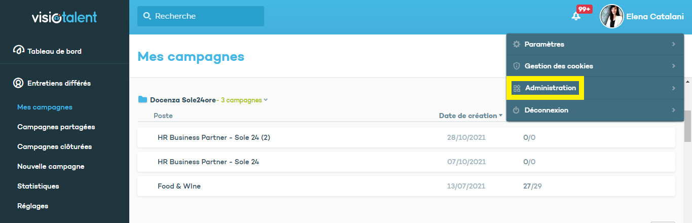 Vous pouvez accéder au Panel directement depuis votre compte Visiotalent en cliquant sur votre nom dans la partie supérieure droite de l'écran, puis sur "Administration".