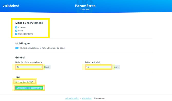 Via la section Paramètres, il est possible de définir un certain nombre de paramètres, notamment : le type de sélection effectuée (externe, interne, école), activer la fonction multilingue, définir un temps de réponse maximum pour toutes les campagnes et le délai maximum (temps pendant lequel le candidat peut répondre à son entretien vidéo une fois que le délai indiqué par le recruteur a expiré) et enfin activer un SSO.
